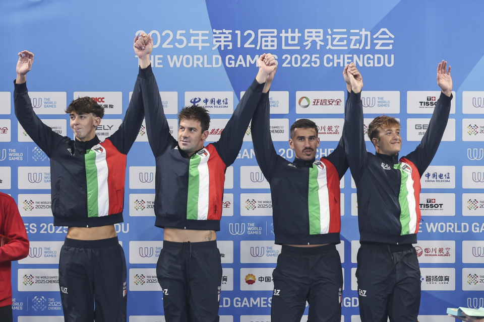 当日,2025年成都世运会男子4x25米运送假人接力决赛举行。